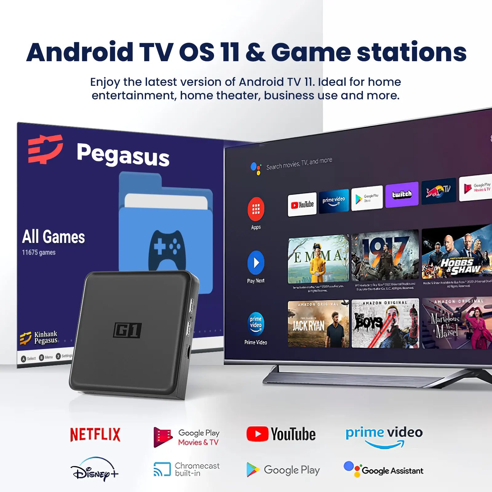KINHANK G1 is a real 4K streaming set-top box powered by Amlogic S905X4-J ARM Quad 64-bit Cortex-A55 with AV1 HDR, running on the Android 11.0 ATV system. Built-in lots of content and entertainment, including 4K Netflix, YouTube, Prime Video, Disney Plus, etc, stream what you love!